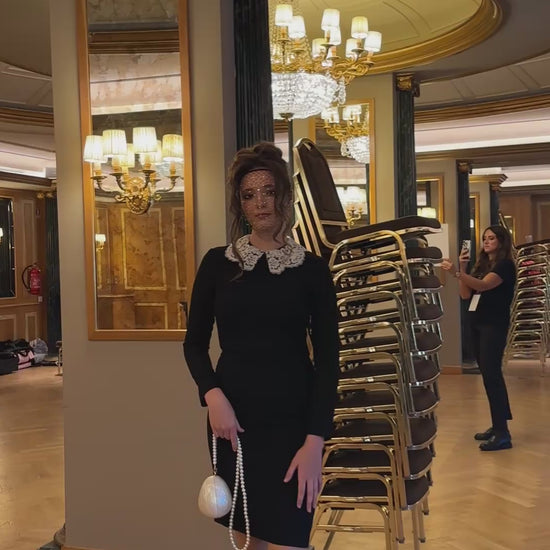 Schwarzes Kleid mit Spitzenkragen – zeitlose Eleganz in modernem Stil. Der dichte, elastische Stoff umspielt die Figur, während der kontrastierende weiße Spitzenkragen dem Look Raffinesse und einen verleiht. Der puristische Schnitt, lange Ärmel und die knieumspielende Länge machen das Modell vielseitig – fürs Büro, Dinner oder besondere Anlässe.