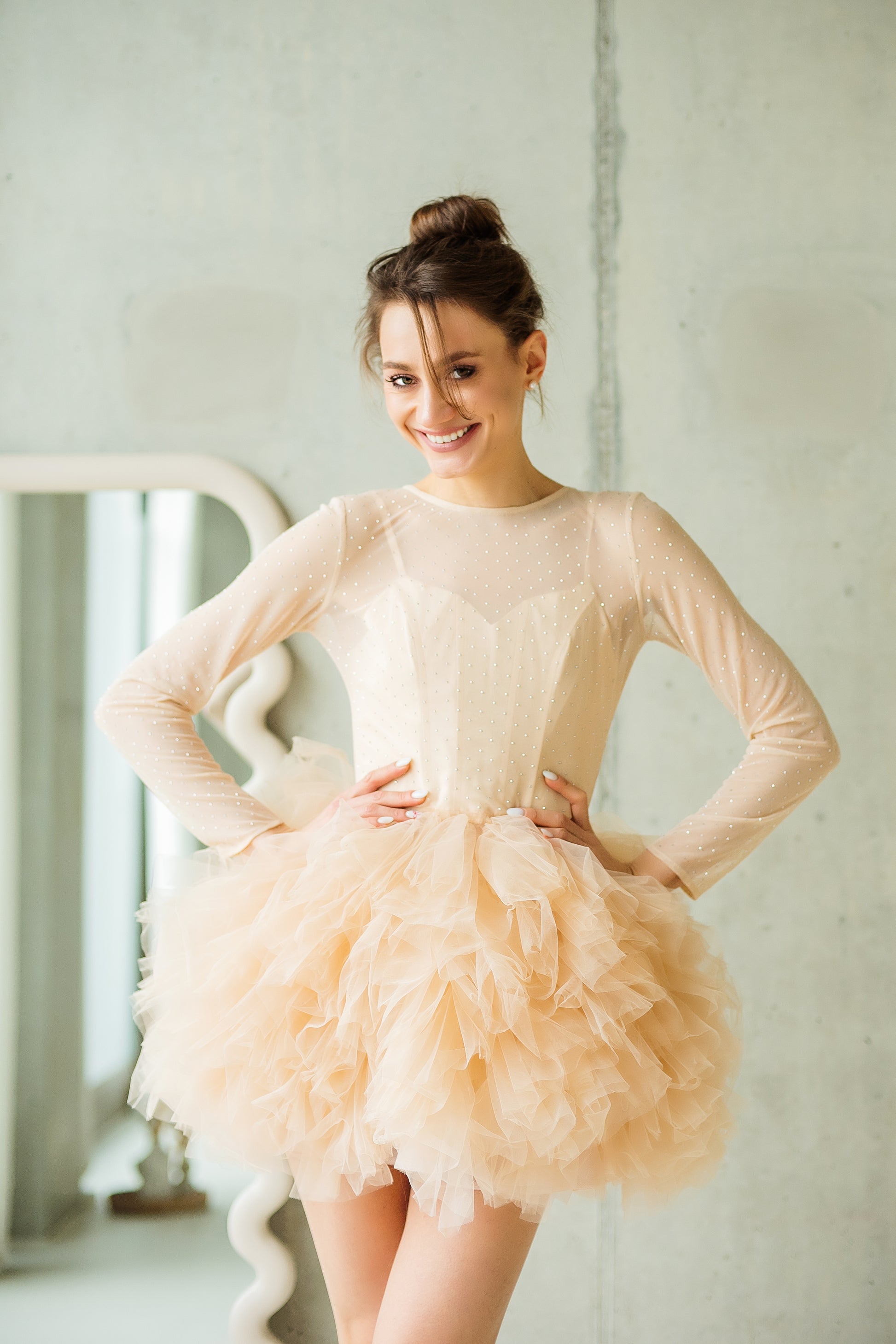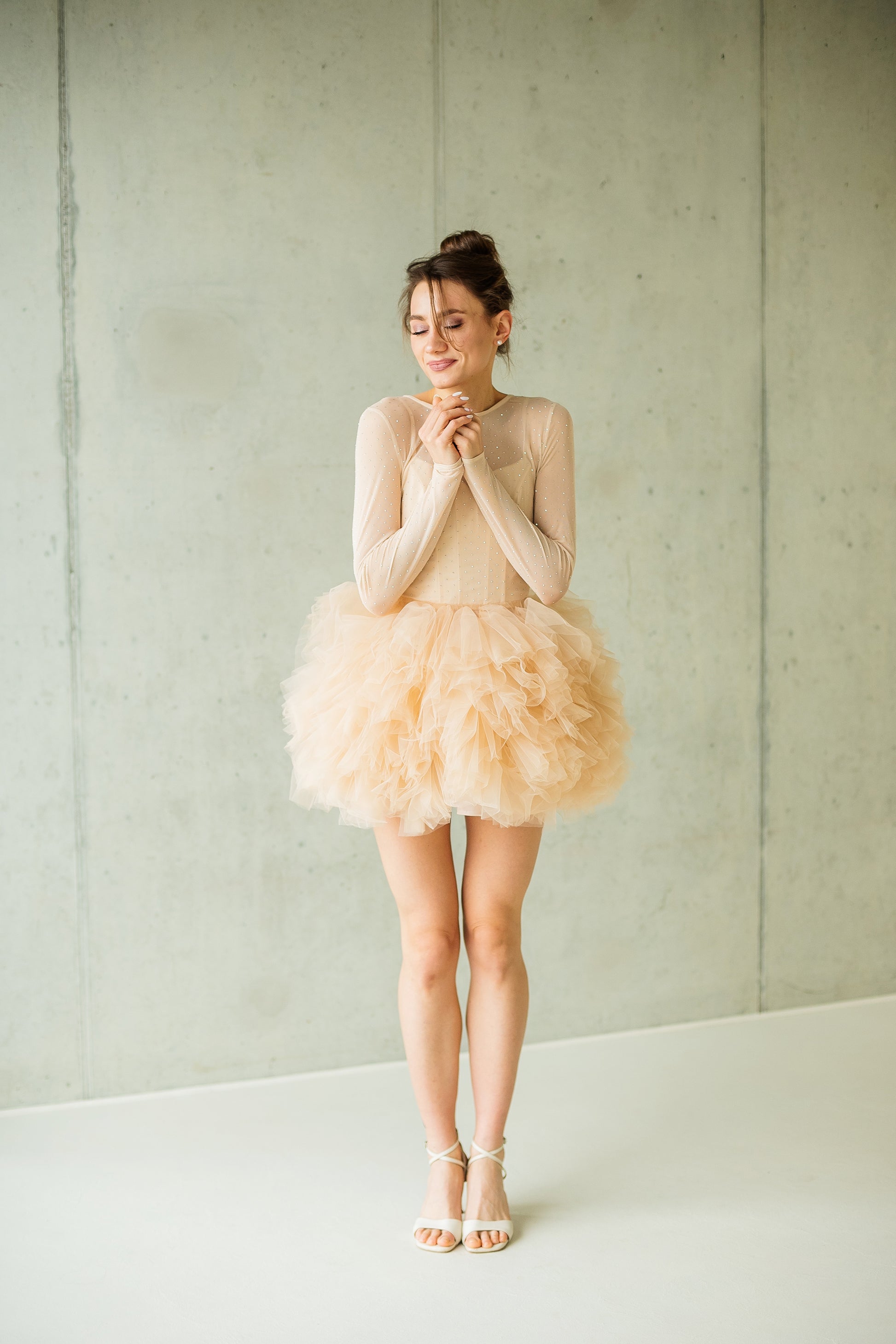 Kurzes Kleid in hellbeigem Ton mit Korsettoberteil, italienischem Netz mit Steinen und voluminösem Rock