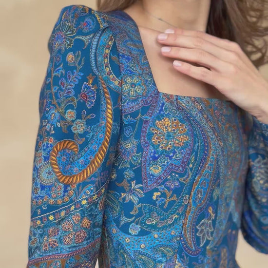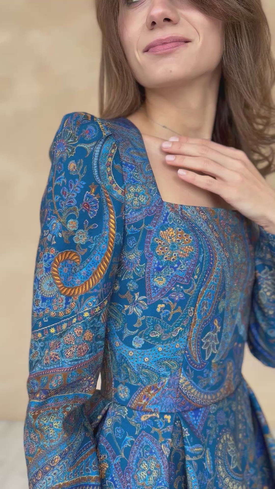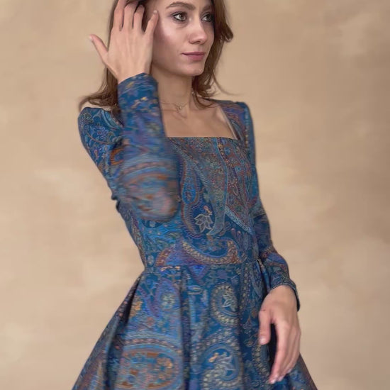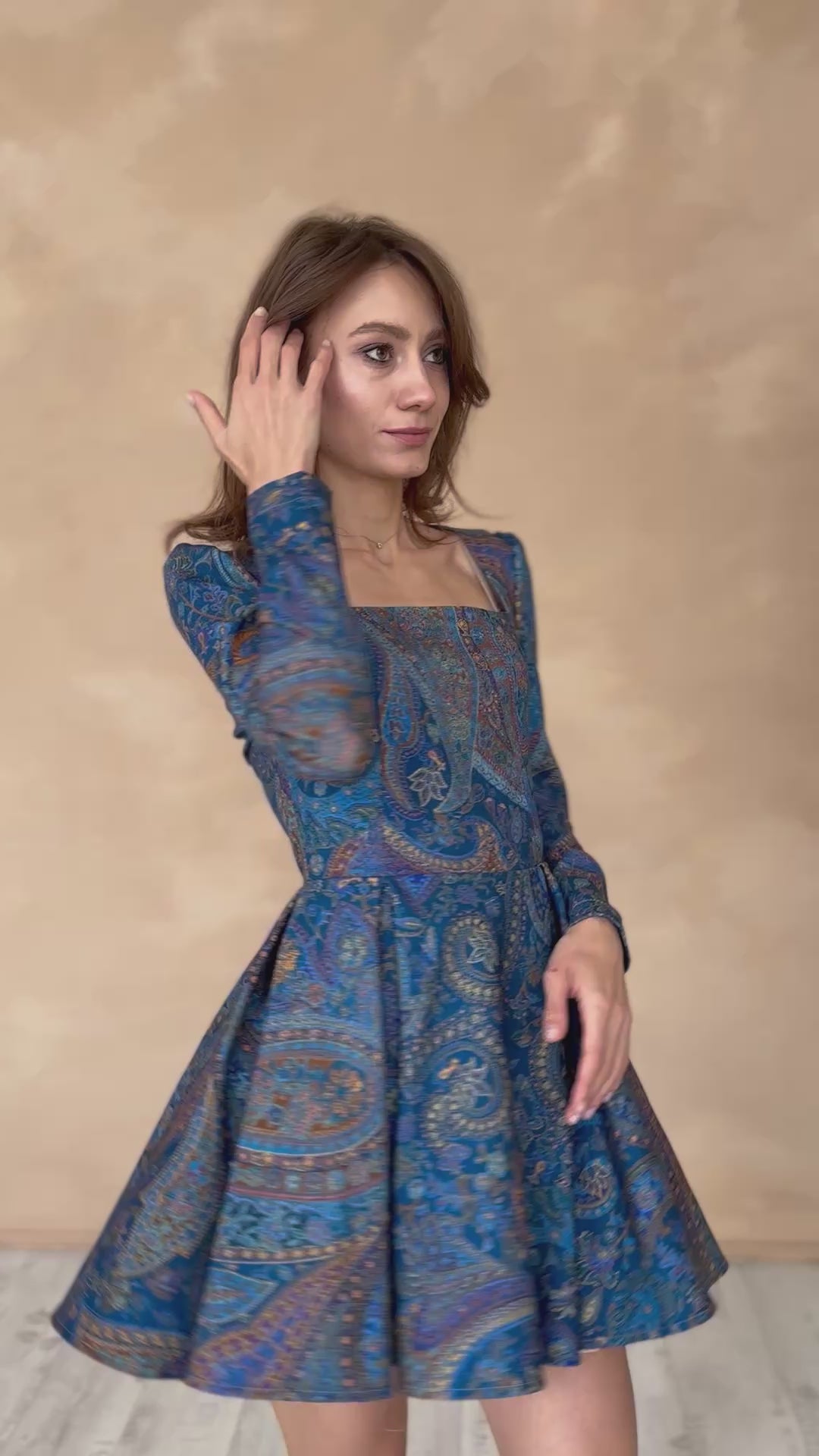 Kleid aus italienischer Wolle mit jacquard‑inspiriertem Paisley-Muster. Der taillierte Oberteil und der ausgestellte Rock erzeugen Dynamik und strecken die Silhouette. Quadratischer Ausschnitt und strukturierte Schultern betonen Dekolleté und Haltung.
