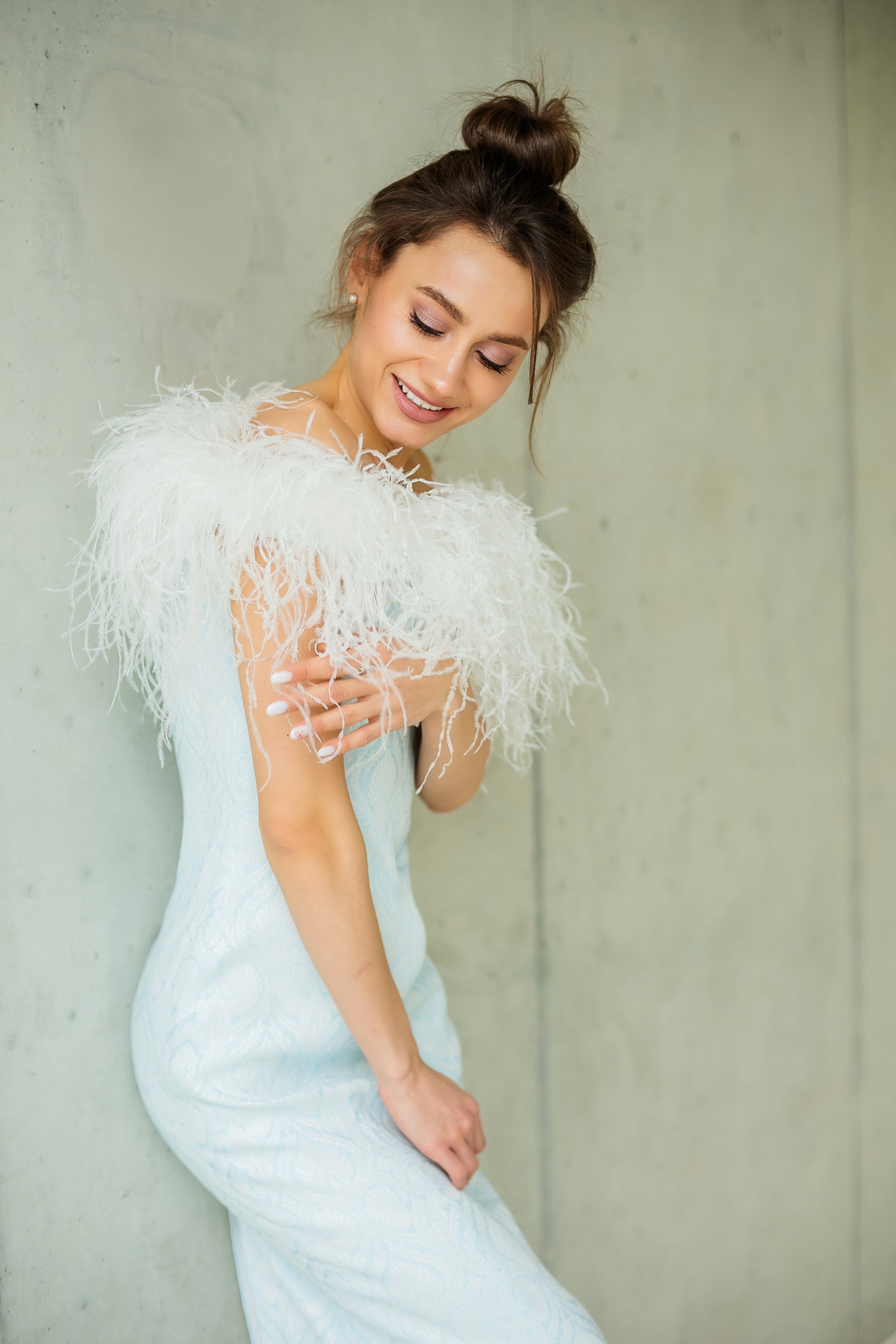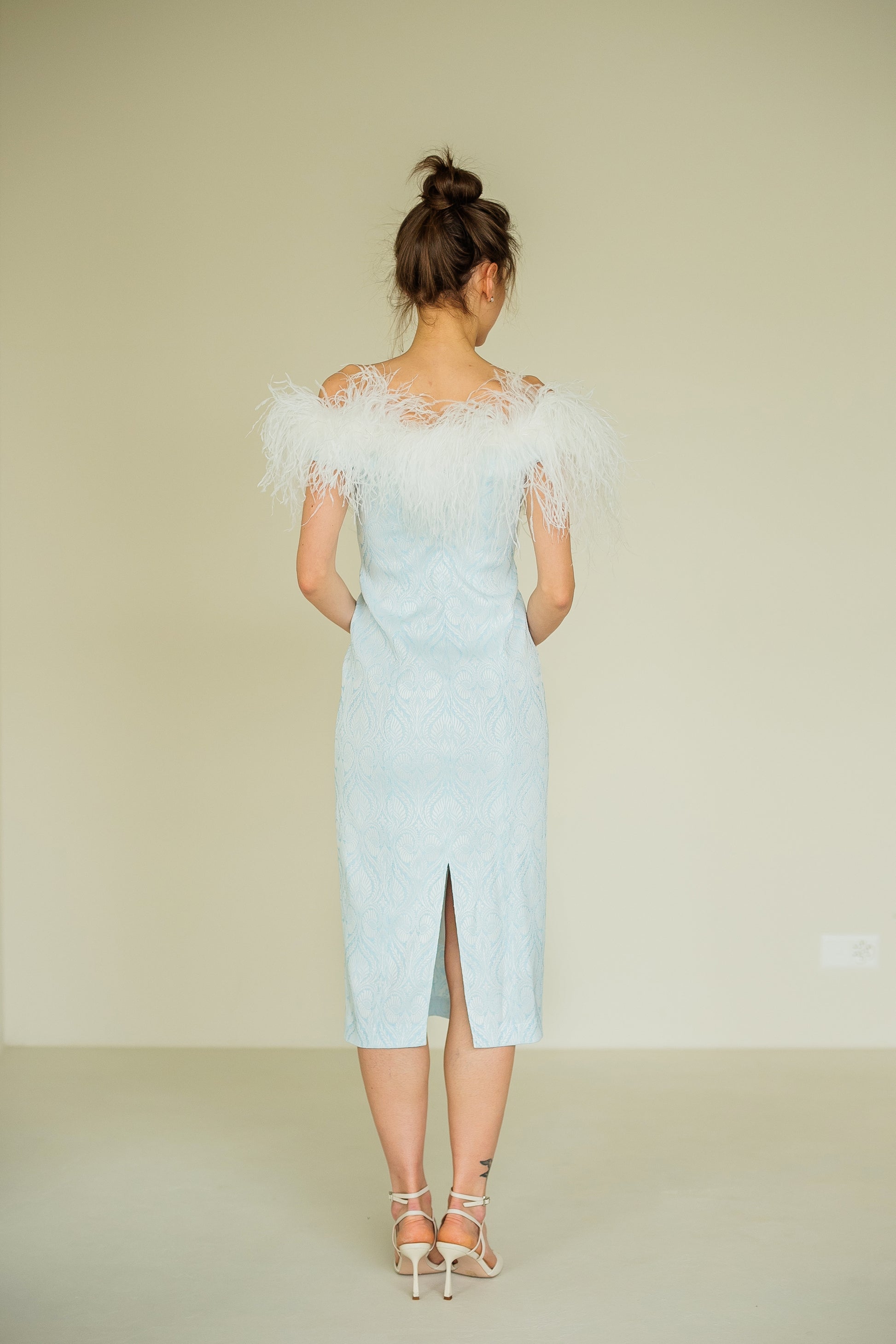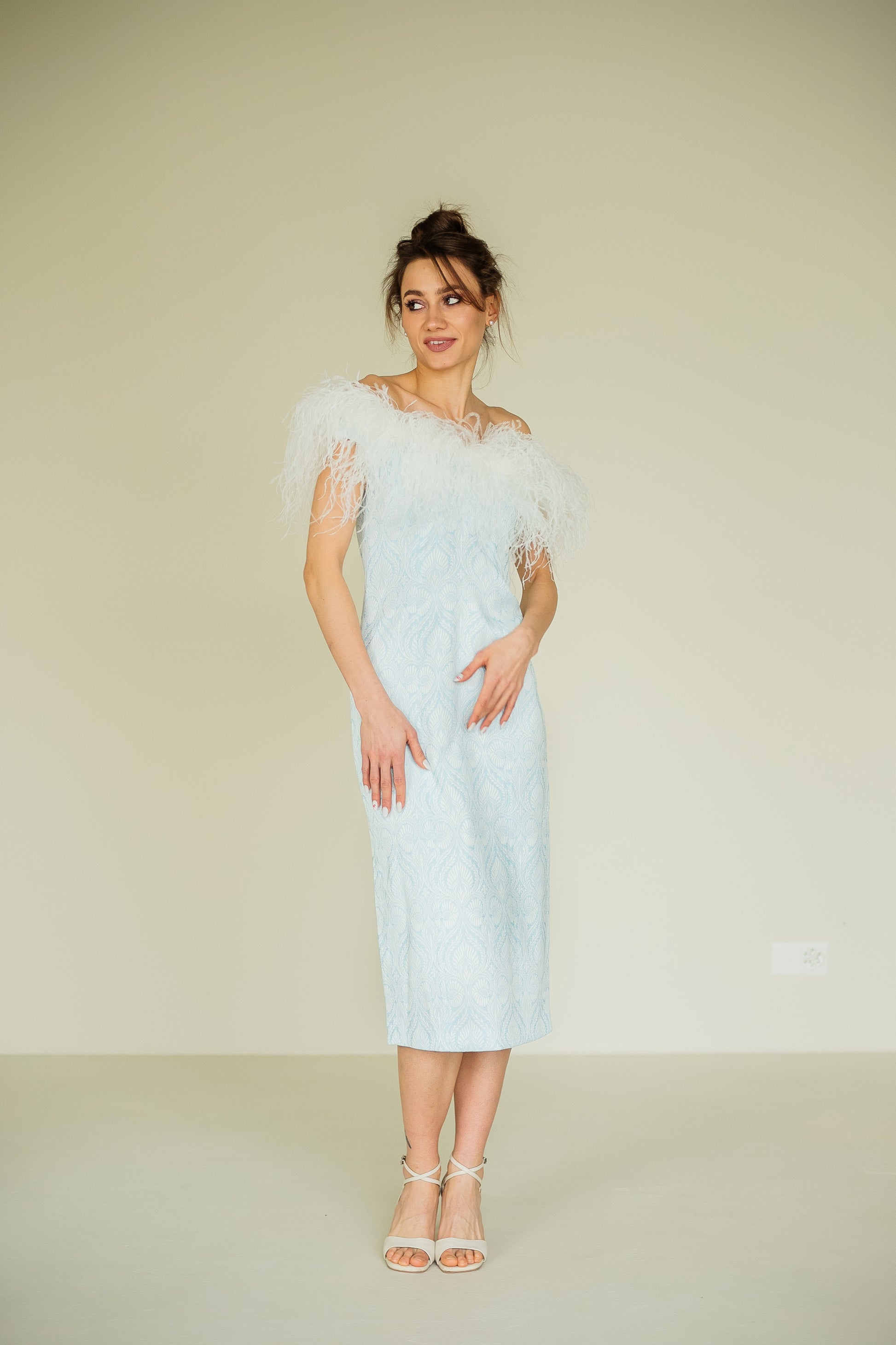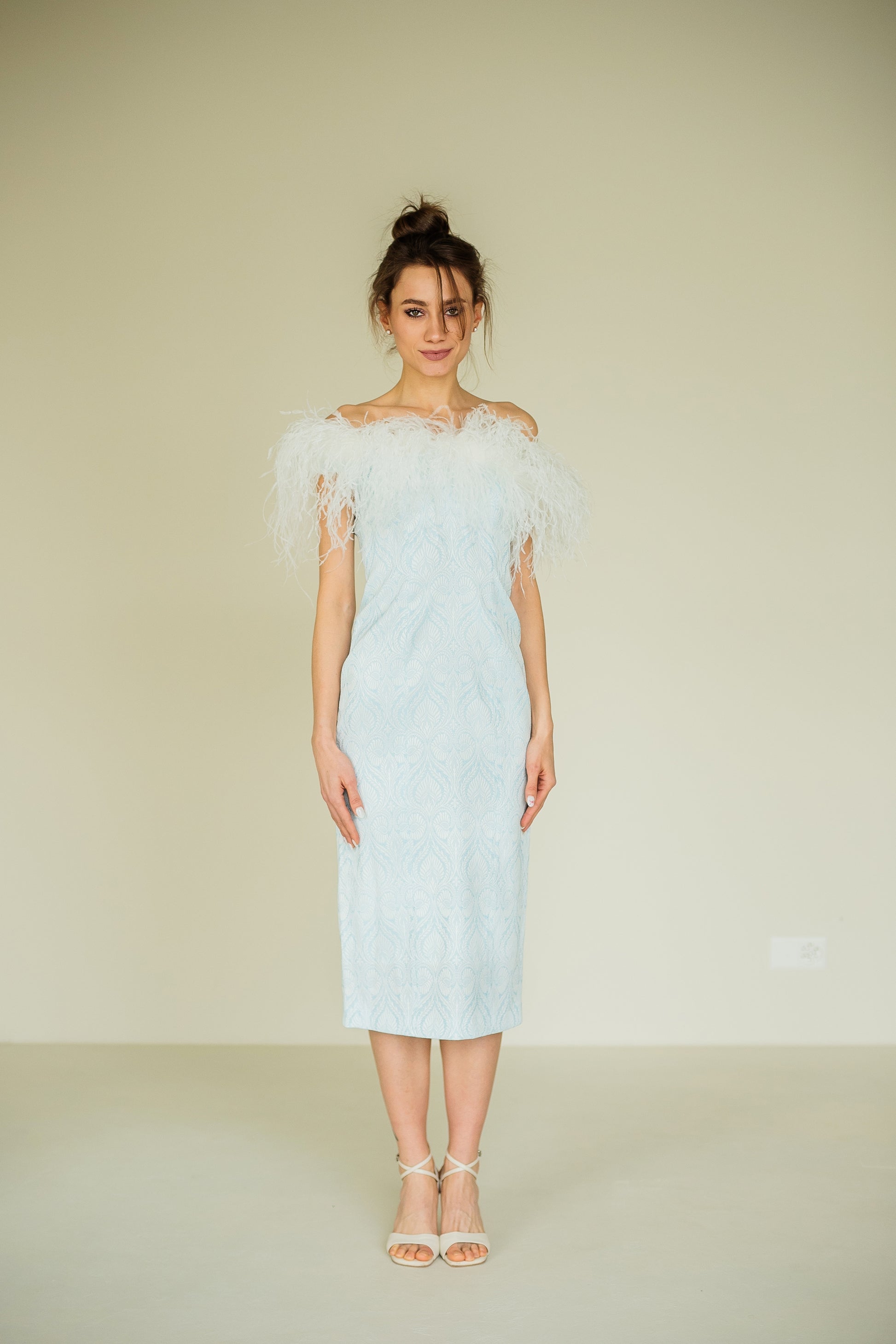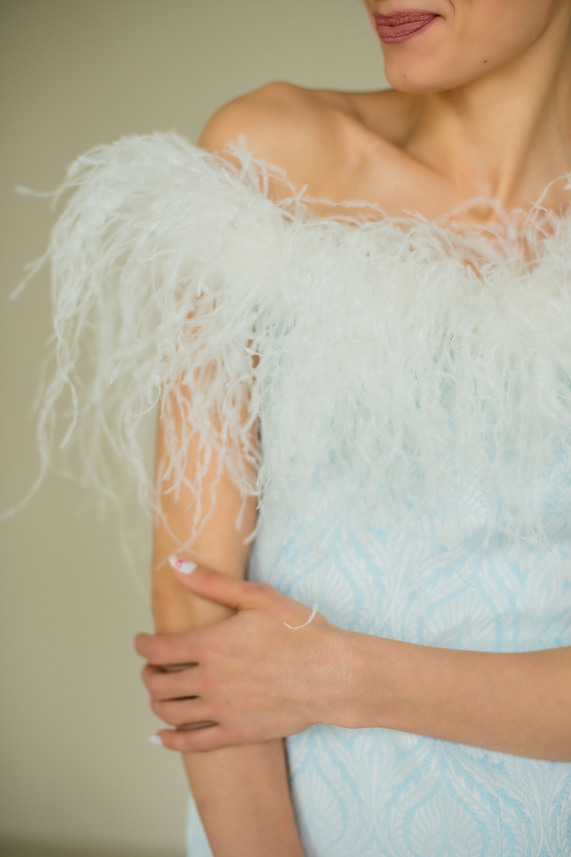 Der raffinierte Carmen-Ausschnitt setzt die Schulterpartie kunstvoll in Szene, während der luxuriöse Besatz aus natürlichen Straußenfedern dem Design eine couturehafte Ausstrahlung und Dynamik verleiht.